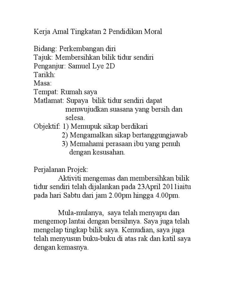 Pelajar boleh menuliskan laporan tentang diri sendiri seperti menolong cikgu mengambil buku menghadiri kem menolong ibu membuat kerja rumah. Kerja Amal Pendidikan Moral F4 F5 - 1. Ng Chi San pelajar Matlamat.